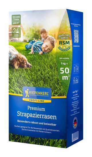 Profi-Line Active.StrapazierRasen. Robust und sehr belastbar. Keimstark und vital. Dicht und sattgrün. Geringe Aufwandsmenge: nur 20 g/m². Reicht für 50 m².