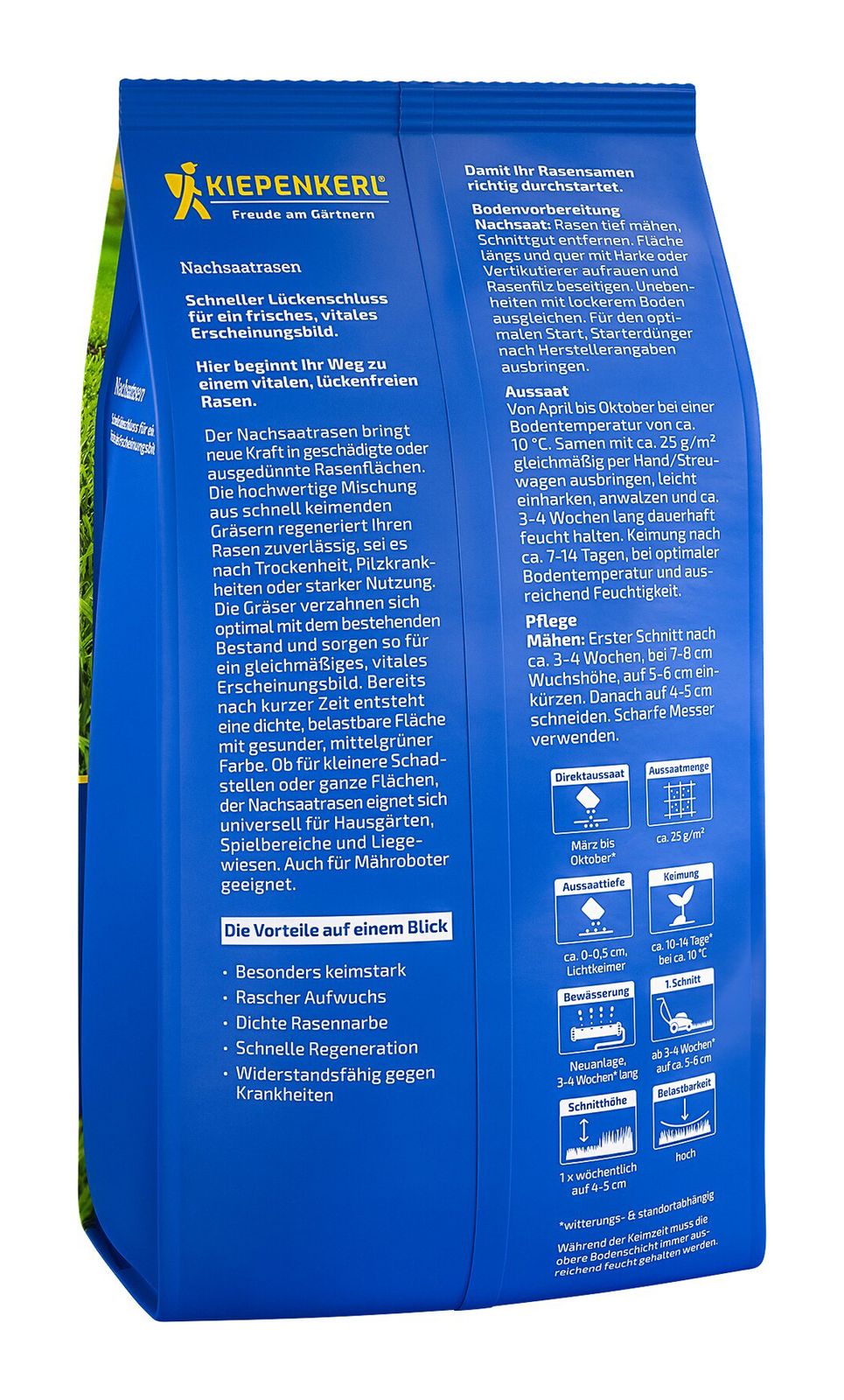 Der Kiepenkerl Regenerations-Rasen ist eine spezielle Rasenmischung zur Ausbesserung schadhafter Rasenstellen. Für die Ausbesserung von Lücken und Rasenschäden, die zum Beispiel durch Wühlmäuse, Maulwürfe oder Rasenkrankheiten entstanden sind. Ideal auch für die Ausbesserung von Lücken nach dem Vertikutieren. In wenigen Wochen nach der Aussaat wächst ein gesunder, strapazierfähiger Rasen.